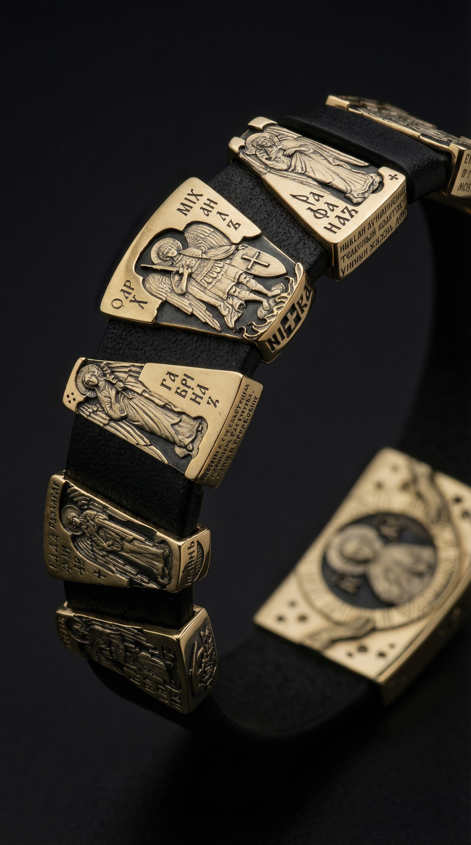 Православний браслет із натуральної шкіри із золотими вставками. За основу створення цього браслета було взято ікону Собору Архістратига Михайла та інших Небесних Сил безтілесних.